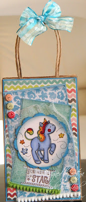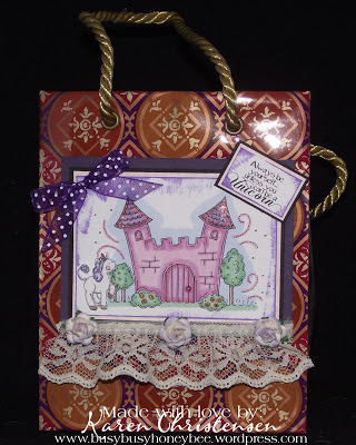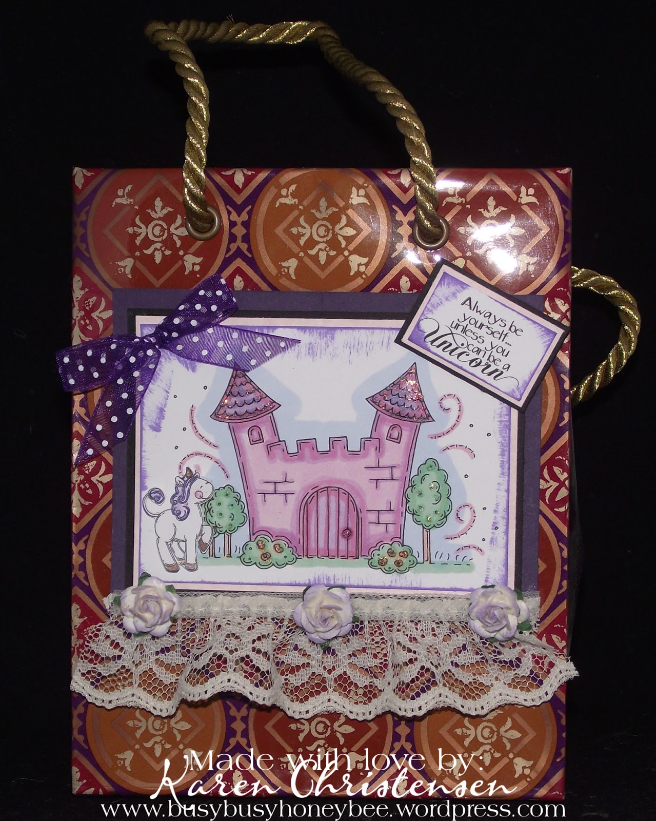 a decorated gift bag using Daisy Dancy Unicorn and precolored Fairy Tale Castle