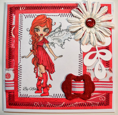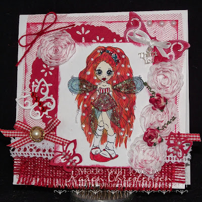 We also have a Special Guest Designer this week - our former teamie, Annette. Now she's gone ALL out and used ALL THREE!!! What a girl! What a gorgeous card!!! Fibres are the stamping linen onto which my image is stamped, Ribbon is a strip of my favourite 15mm wide satin in a gorgeous rich red and Twine is a bit of red twine tied in a triple bow and holding on my baby silver bell.